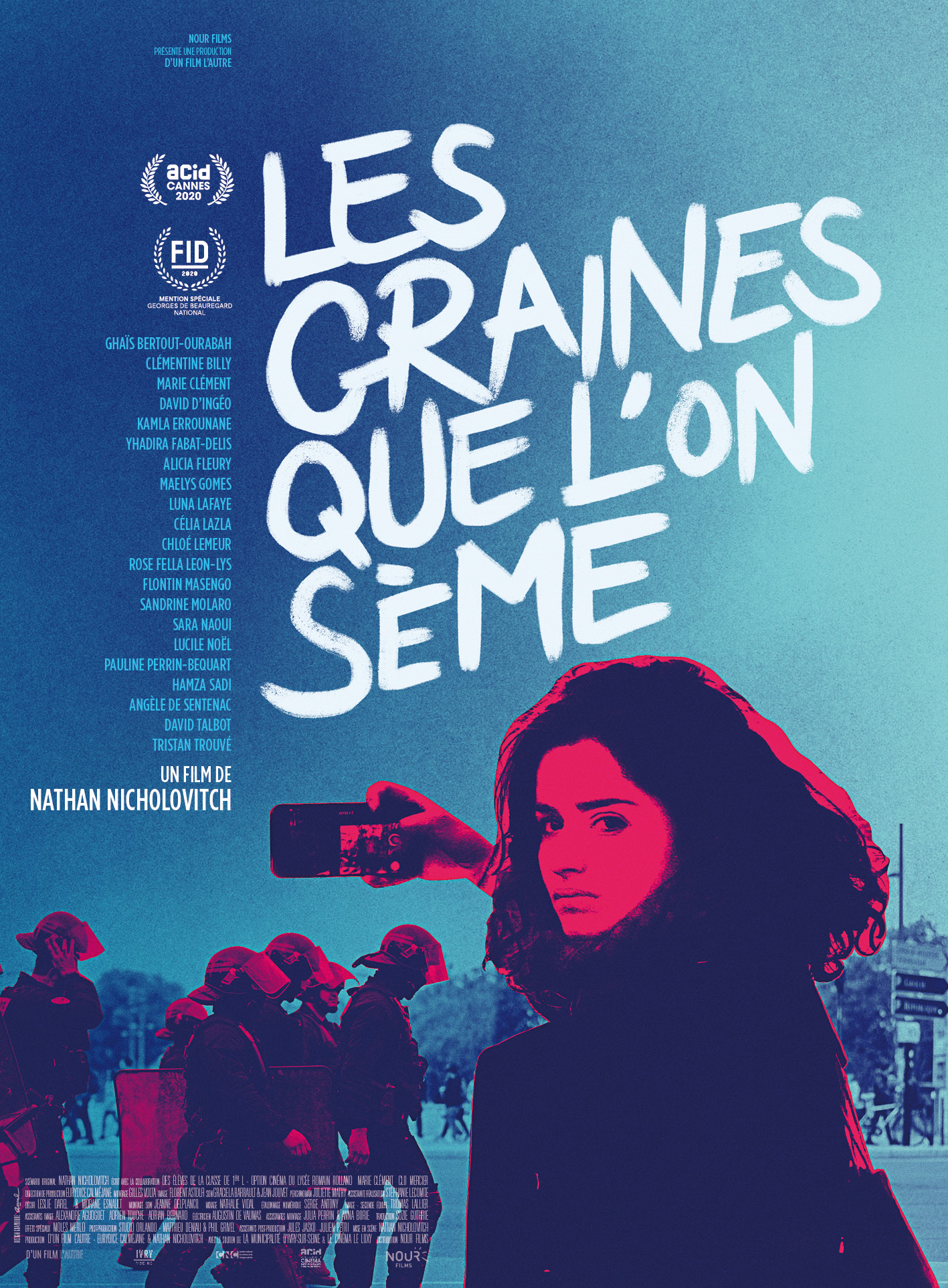 Enfin et en parallèle, dès le premier atelier, j’ai demandé aux lycéens de venir chaque semaine au lycée avec 3 plans filmés au téléphone portable sur « un état du monde ». Nulle mise en scène ou dialogues ne devait y figurer. Je voulais voir simplement des plans de 30 secondes au minimum tirés de leur quotidien, de leur réalité, de ce qu’ils vivaient. C’était une manière de les faire entrer en cinéastes dans ce bourbier de l’hiver 2018-2019. Ces images ont accompagné l’écriture du scénario et ont enrichi le film jusqu’à la fin du montage.
